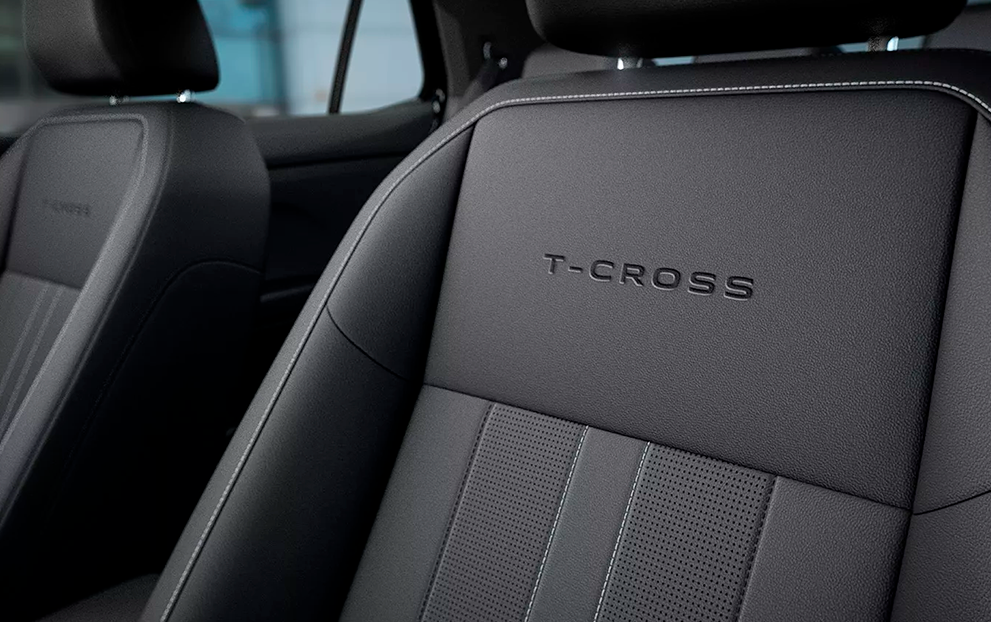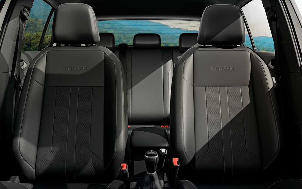 Os assentos tem novo acabamento e contam com um detalhe especial: o logo T-Cross na parte superior dos bancos dianteiros. Detalhes que fazem toda a diferença.